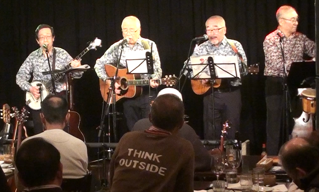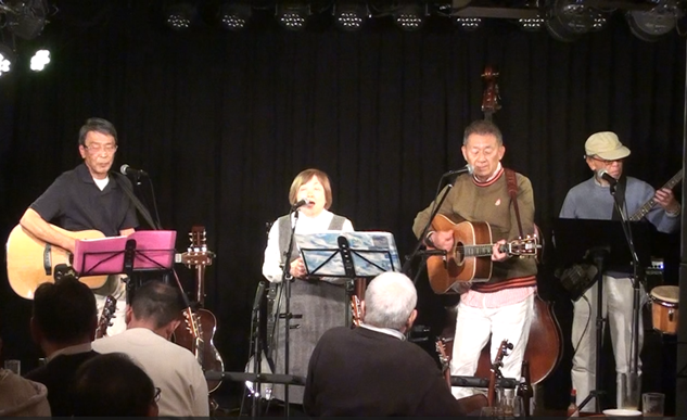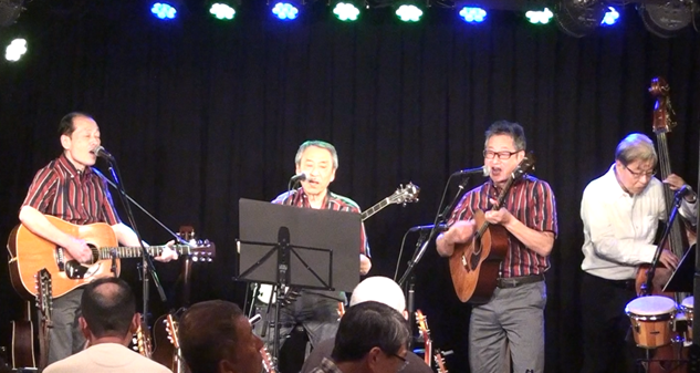 ▼腰痛のため、1名は座っての演奏でしたが、元気一杯の歌声 ▼取り上げる曲はキングストン通をうならせる「シブイ曲」が多いが今回も大きな拍手 ▼歌声にハリがあるのは、まだまだ若い証拠でしょうか。 |